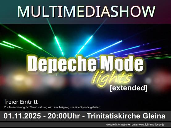 #DepecheMode feiert dieses Jahr 45-jähriges Bestehen, die Veröffentlichung ihres erfolgreichsten Albums #Violator liegt 35 Jahre zurück. Grund genug, der Multimedia-#Lasershow #DepecheModelights ein Update zu verpassen und die Musik der Band angemessen zu feiern! Kommen Sie also gern mit auf die Reise: Am 1.11.2025 in die #Trinitatiskirche #Gleina. Der Eintritt ist frei, am Ausgang wird um eine Spende zur Finanzierung der Veranstaltung gebeten.